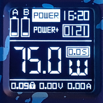Затем ByPass, он же режим мехмода. В нем настроек нет, а плата отдает не 4.2 вольта, имитируя обычный однобатарейный мехмод, а все что есть в батарейках. Это логично, но получается крайне мощно, под рукой не нашлось атомайзера, который смог бы столько принять. Впрочем, ByPass это игрушка, реальной пользы в нем нет.