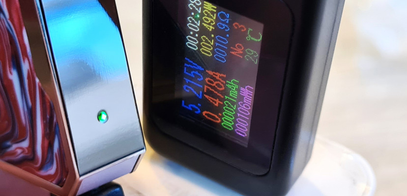 На зарядке девайс принимает практически 0.5А, как и заявлено, но у DRAG Nano довольно большая батарейка для такого компактного корпуса, так что на проводе нужно просидеть около полутора часов.