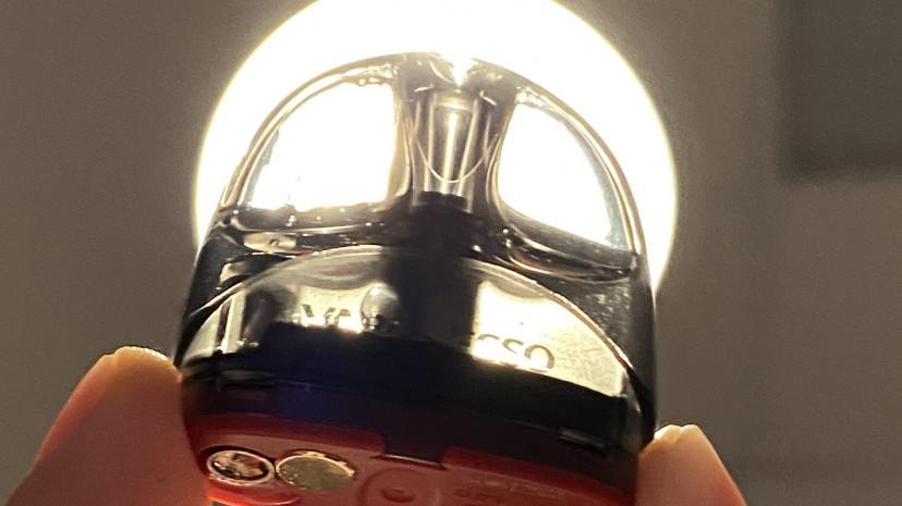 Начнем, конечно же, с картриджа. Он имеет прозрачные стенки, благодаря которым легко отследить остаток жидкости. Если же жижи осталось немного, это по-прежнему получится сделать, просто наклонив Под. О контакте бачка с батарейным блоком здесь сигнализируют светодиоды. Кстати, при затяжке они также активируются, переливаясь по очереди от нижнего к верхнему, выглядит прикольно.